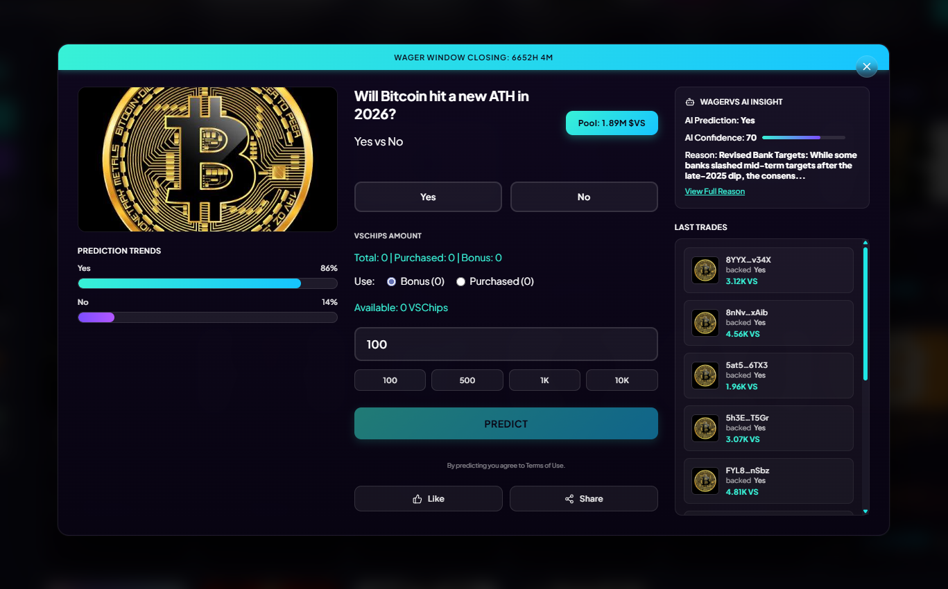 WagerVS is a creator-focused prediction platform where users create challenges on real-world events (sports, crypto, politics, pop culture, etc.) and compete head-to-head in skill-based PvP matches.